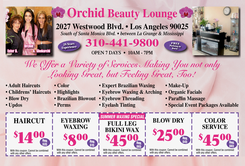 Orchid Beauty Lounge is located in Westwood, CA featuring Mens and Womens Haircuts, Hair Color, Hair Extensions, Perm, Hair Highlights, Eyelash Tinting, Eyebrow Arching, Body Wax, Facial, Make up, Paraffin Massage and more ... Serving client of Los Angeles and Southern California Communities and cities such as: Beverly Hills, West Los Angeles, Westwood, Santa Monica, Hollywood, West Hollywood, North Hollywood, Manhattan Beach, Huntington Beach, Venice Beach, Long Beach, Torrance, El Segundo, Glendale, Sherman Oaks, Encino, Tarzana, Reseda, Canoga Park, Thousand Oaks, Westlake, Camarillo, Simi Valley, Chatsworth, Granada Hills, Woodland Hills and more ...